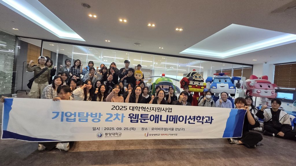 동양대학교 웹툰애니메이션학과는 웹툰애니메이션 인재 양성을 위해 지난 25일 애니메이션 기업 ‘(주)로이비주얼’ 에 현장 탐방을 진행했다고 밝혔다. 이번 탐방은 동양대학교 취업학생처가 주관해 ‘2025년 대학혁신지원사업 첨단 실무형 역량 전수를 위한 지역 현장 탐방 및 전공 심화 교육 프로그램(기업탐방)으로 ㈜로이비주얼 소개와 ‘애니메이션 산업의 트랜드 및 취업’에 대한 특강과 질의응답으로 진행됐고, 2층에 있는 ㈜로이비주얼 쇼룸을 통해 다양한 굿즈 상품을 구경하기도 했다.